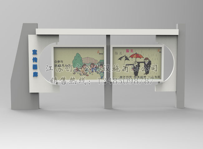公司技術力量雄厚,工藝流程科學,質量檢測體系完善,采用較好的原材料,嚴把質量關,本著“誠信為本、務實創新、客戶至上”的經營理念頑強拼搏,銳意進取,握準時代脈搏,產品不斷競進提質、推陳出新。產品銷售二百多個多個城市,我公司還可根據客戶的要求,訂做生產不同規格的款式宣傳欄,公交候車亭,法治宣傳欄,消防宣傳欄,部隊宣傳欄,校園文化宣傳欄等。目前與國內眾多政府單位、部隊、廣告公司建立了長期穩定的合作關系,并得到了客戶的高度認可。我們不僅僅為客戶提供高質量的產品,更有新穎的創意和較好的售后服務,贏得了廣大新老客戶的一致好評。